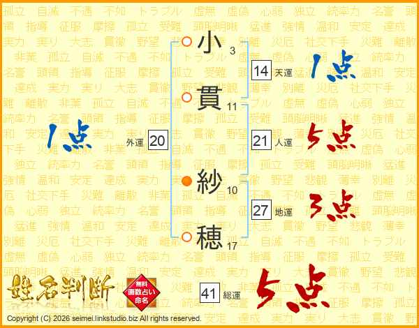 小(3画)貫(11画) 紗(10画)穂(17画)