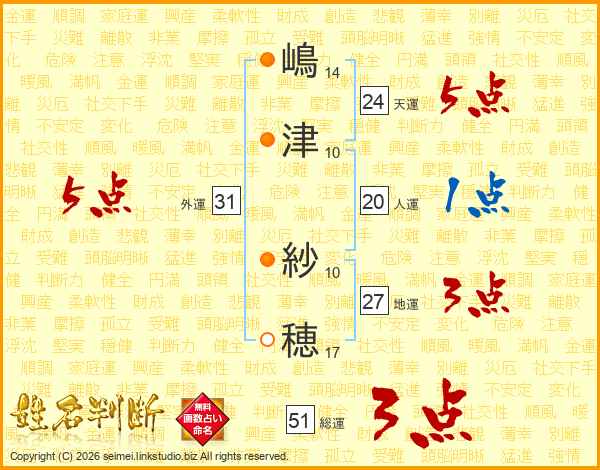 嶋(14画)津(10画) 紗(10画)穂(17画)