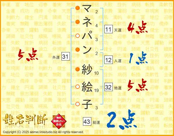 マ(2画)ネ(4画)パ(3画)ン(2画) 紗(10画)絵(19画)子(3画)