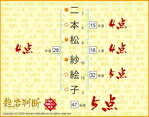 二(2画)本(5画)松(8画) 紗(10画)絵(19画)子(3画)