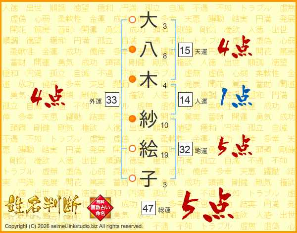 大(3画)八(8画)木(4画) 紗(10画)絵(19画)子(3画)