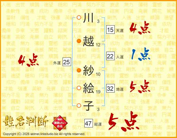 川(3画)越(12画) 紗(10画)絵(19画)子(3画)