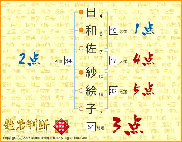 日和佐紗絵子さんの総運は51画の3点!