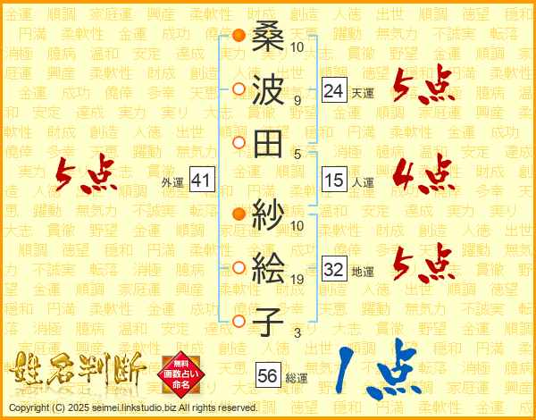 桑(10画)波(9画)田(5画) 紗(10画)絵(19画)子(3画)