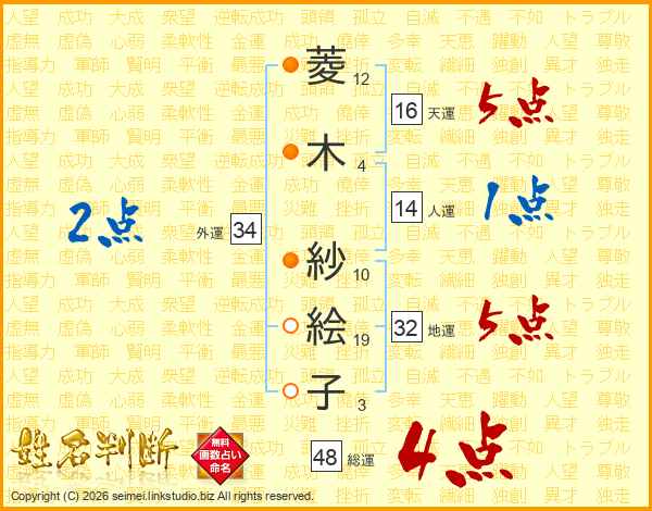 菱(12画)木(4画) 紗(10画)絵(19画)子(3画)