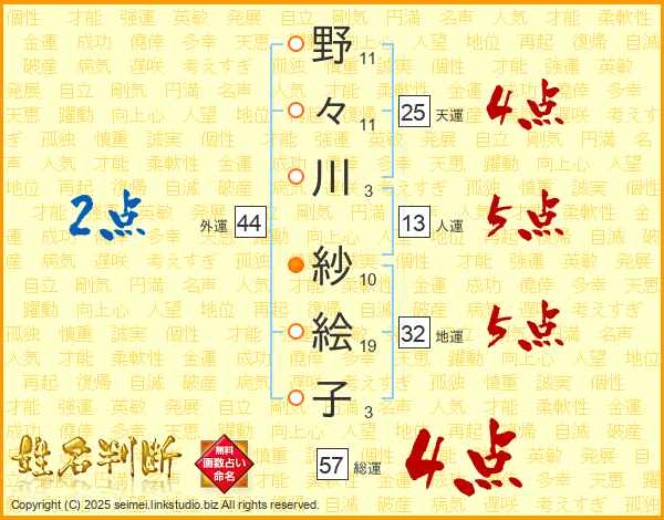 野(11画)々(11画)川(3画) 紗(10画)絵(19画)子(3画)