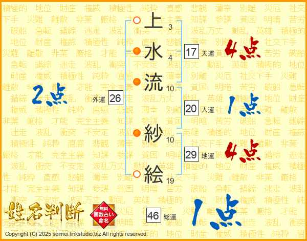 上(3画)水(4画)流(10画) 紗(10画)絵(19画)