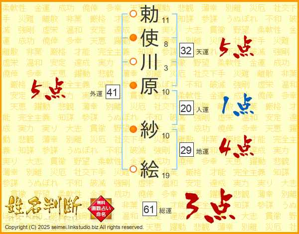 勅(11画)使(8画)川(3画)原(10画) 紗(10画)絵(19画)