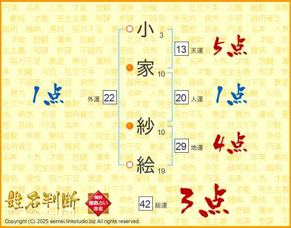 生活面を象徴する運勢です。外部から受ける影響力を表し、結婚運、家庭運や職場、環境への順応性を表します。総運から人運を引いた画数。姓や名が1文字の場合を除く。