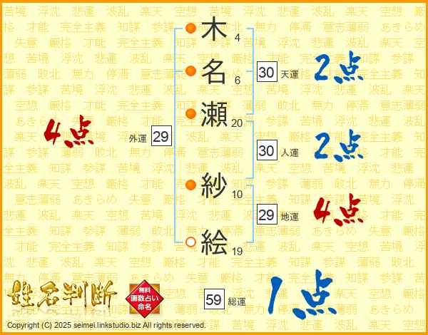 木(4画)名(6画)瀬(20画) 紗(10画)絵(19画)