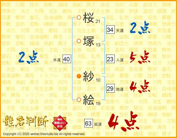 桜(21画)塚(13画) 紗(10画)絵(19画)