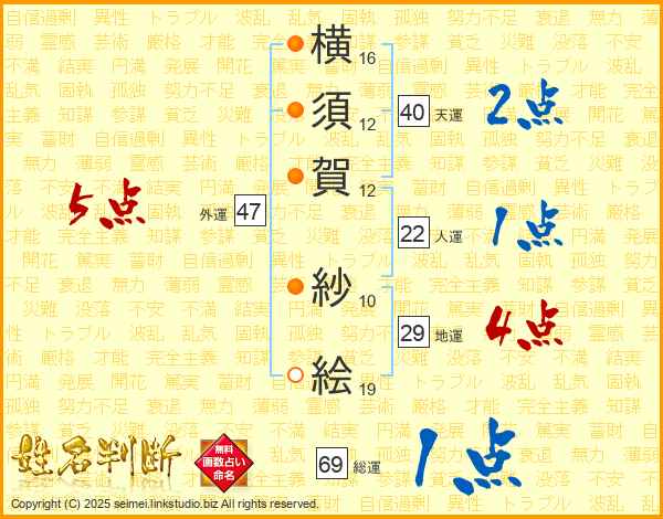 横(16画)須(12画)賀(12画) 紗(10画)絵(19画)