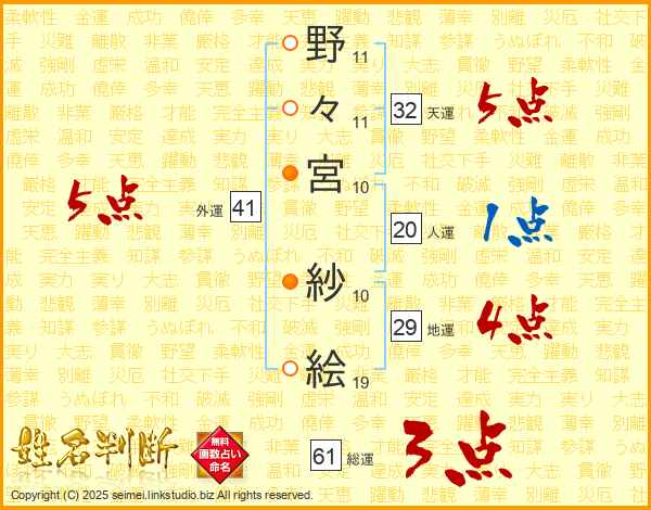 野(11画)々(11画)宮(10画) 紗(10画)絵(19画)