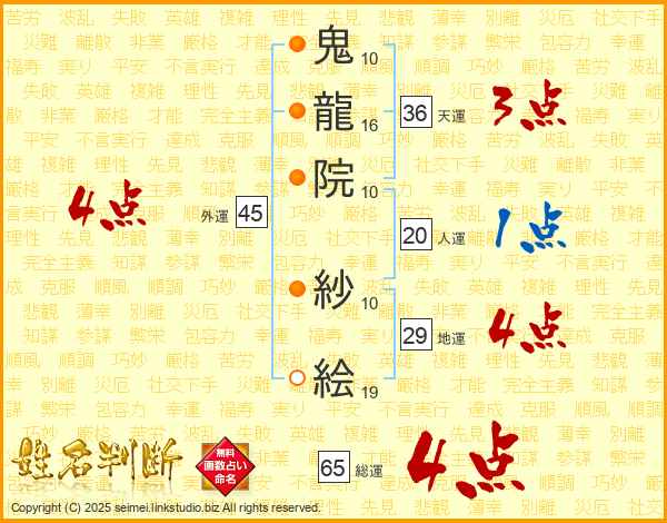 鬼(10画)龍(16画)院(10画) 紗(10画)絵(19画)