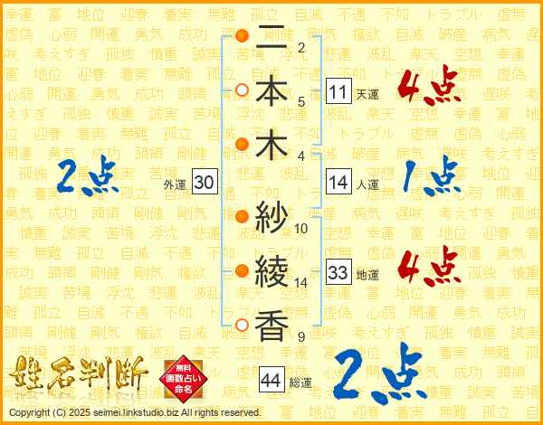 二(2画)本(5画)木(4画) 紗(10画)綾(14画)香(9画)