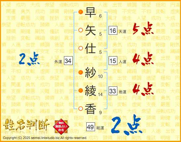 早(6画)矢(5画)仕(5画) 紗(10画)綾(14画)香(9画)
