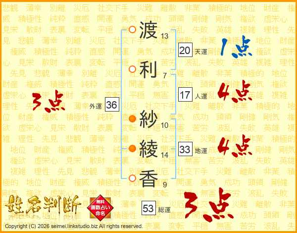 渡(13画)利(7画) 紗(10画)綾(14画)香(9画)