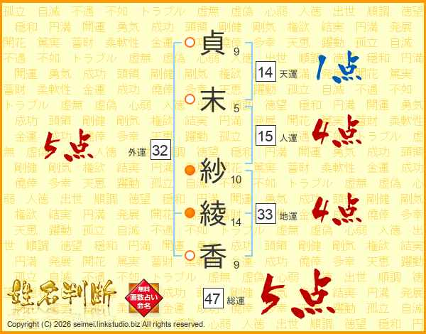貞(9画)末(5画) 紗(10画)綾(14画)香(9画)