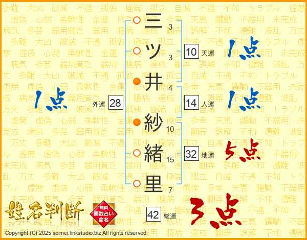 三(3画)ツ(3画)井(4画) 紗(10画)緒(15画)里(7画)
