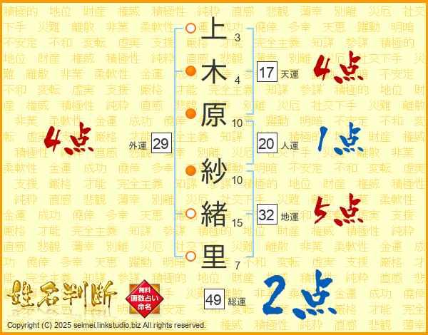上木原紗緒里さんの総運は49画の2点!