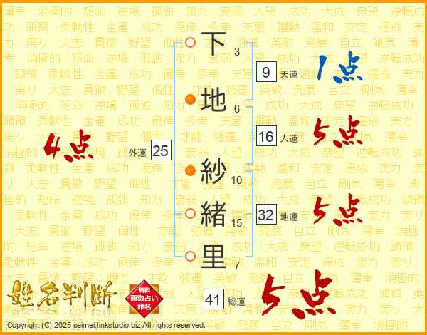 下(3画)地(6画) 紗(10画)緒(15画)里(7画)