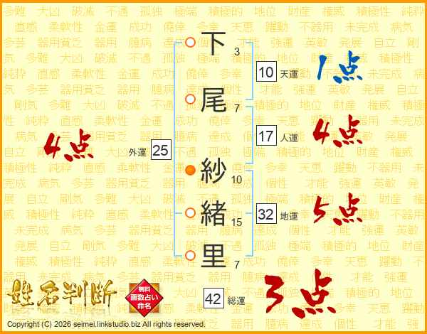 下(3画)尾(7画) 紗(10画)緒(15画)里(7画)