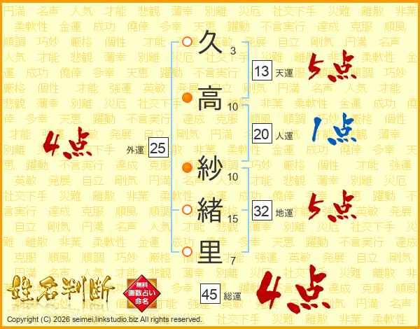 久(3画)高(10画) 紗(10画)緒(15画)里(7画)