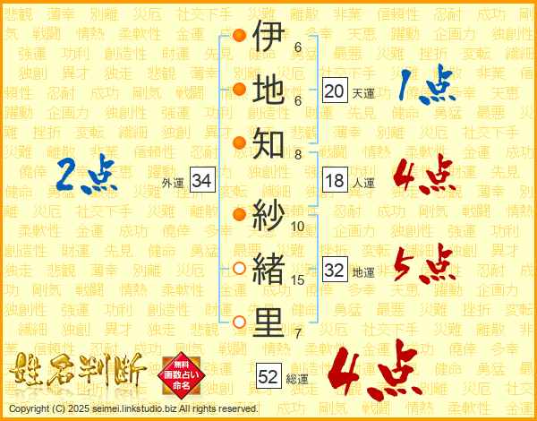 伊(6画)地(6画)知(8画) 紗(10画)緒(15画)里(7画)