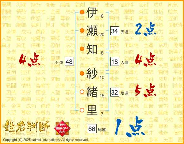 伊(6画)瀬(20画)知(8画) 紗(10画)緒(15画)里(7画)