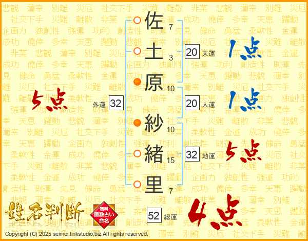 佐土原紗緒里さんの総運は52画の4点!