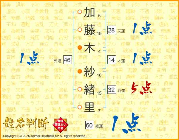 加(5画)藤(19画)木(4画) 紗(10画)緒(15画)里(7画)