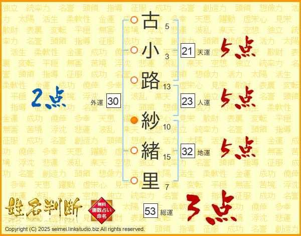 古(5画)小(3画)路(13画) 紗(10画)緒(15画)里(7画)