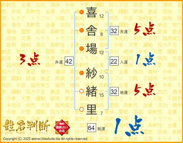 喜舎場紗緒里さんの天運は32画の5点!