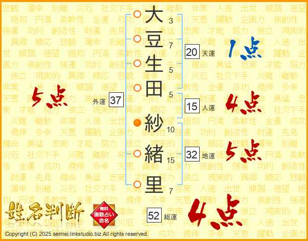 大(3画)豆(7画)生(5画)田(5画) 紗(10画)緒(15画)里(7画)