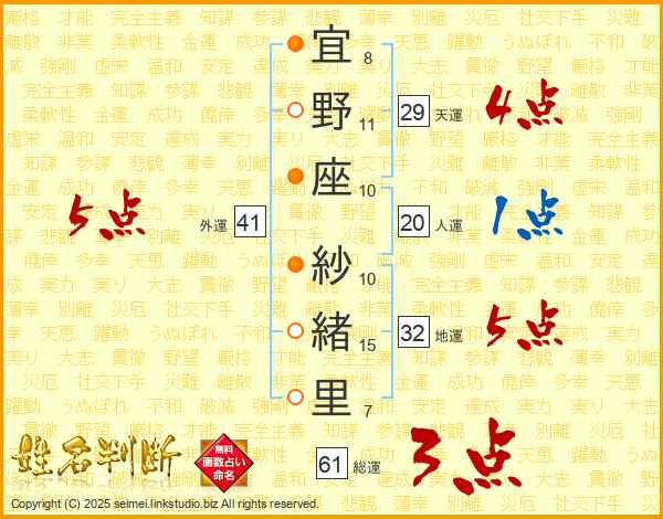 宜(8画)野(11画)座(10画) 紗(10画)緒(15画)里(7画)