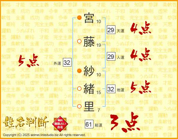 宮(10画)藤(19画) 紗(10画)緒(15画)里(7画)