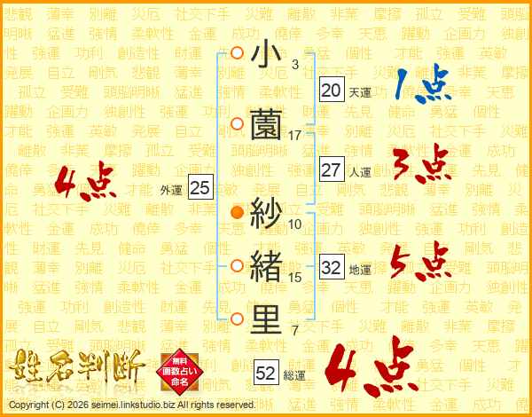 小(3画)薗(17画) 紗(10画)緒(15画)里(7画)