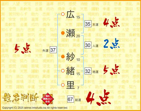 広(15画)瀬(20画) 紗(10画)緒(15画)里(7画)