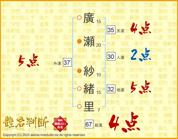 廣(15画)瀬(20画) 紗(10画)緒(15画)里(7画)