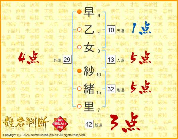 早(6画)乙(1画)女(3画) 紗(10画)緒(15画)里(7画)