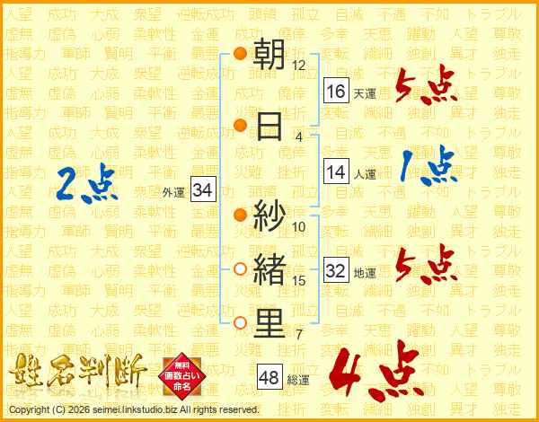 朝(12画)日(4画) 紗(10画)緒(15画)里(7画)