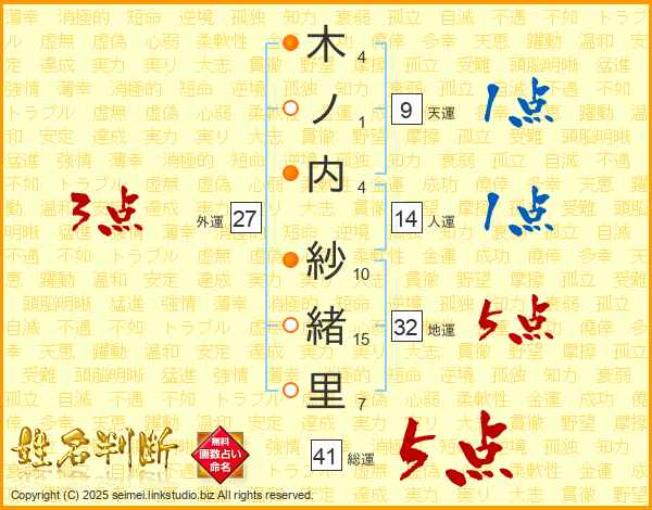 木ノ内紗緒里さんの総運は41画の5点!
