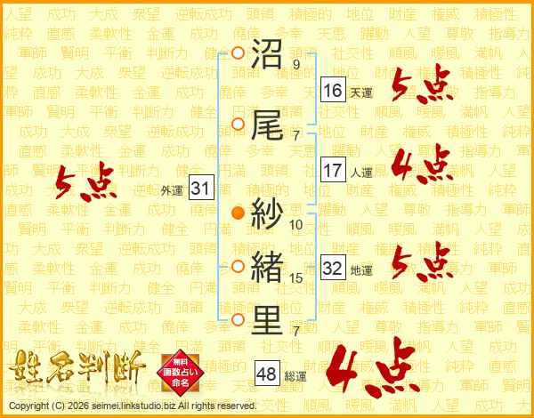 沼(9画)尾(7画) 紗(10画)緒(15画)里(7画)