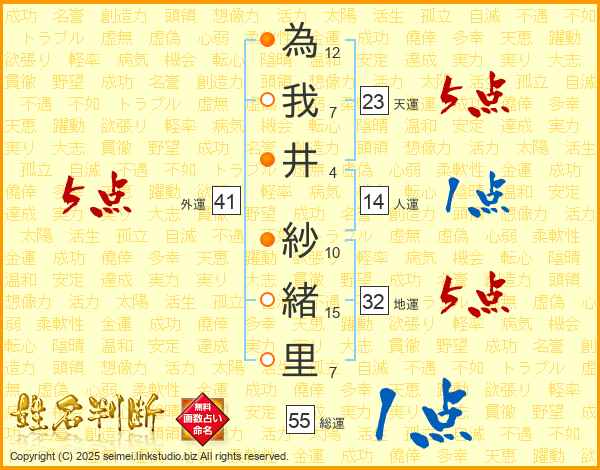 為(12画)我(7画)井(4画) 紗(10画)緒(15画)里(7画)