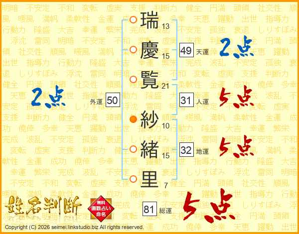 瑞慶覧紗緒里さんの総運は81画の5点!
