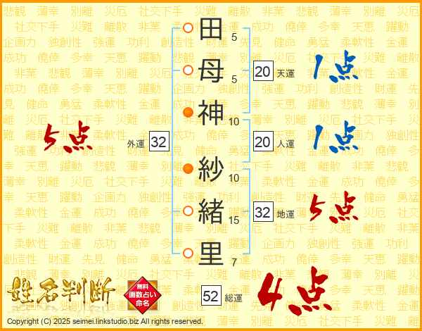 田(5画)母(5画)神(10画) 紗(10画)緒(15画)里(7画)