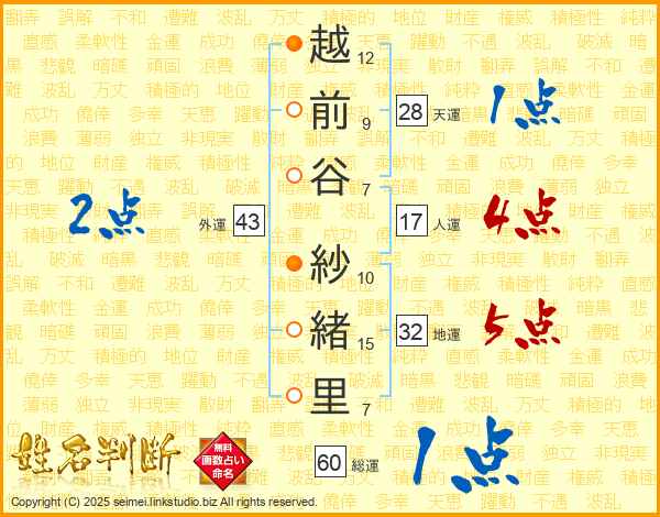 越(12画)前(9画)谷(7画) 紗(10画)緒(15画)里(7画)