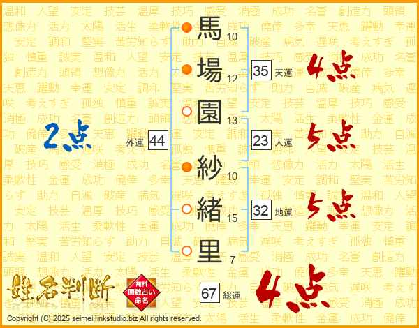 馬(10画)場(12画)園(13画) 紗(10画)緒(15画)里(7画)