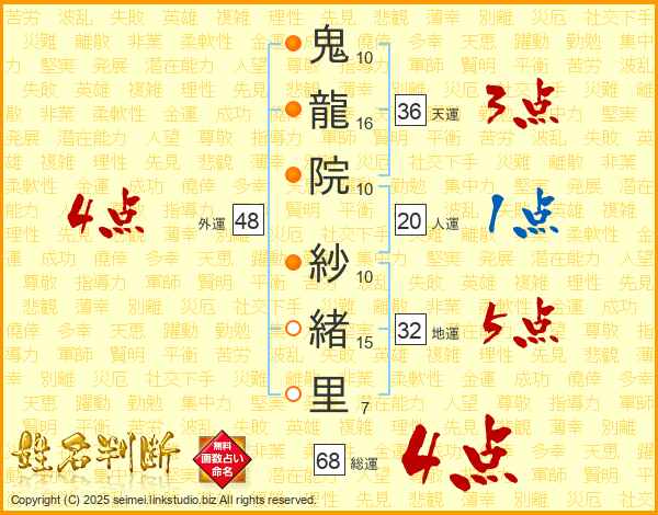 鬼龍院紗緒里さんの外運は48画の4点!