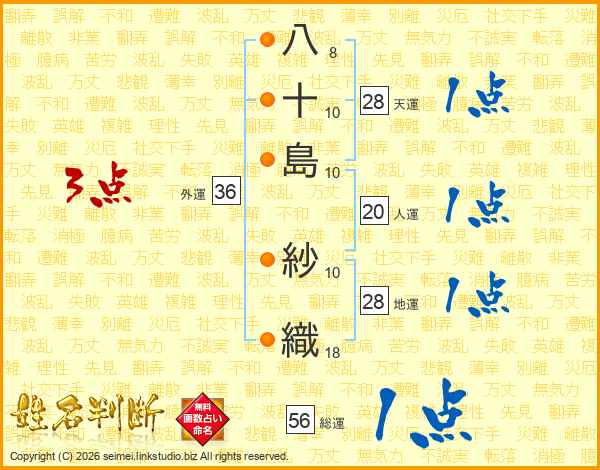 八(8画)十(10画)島(10画) 紗(10画)織(18画)